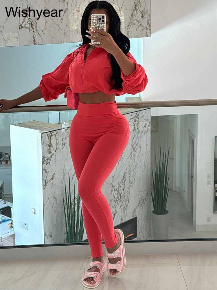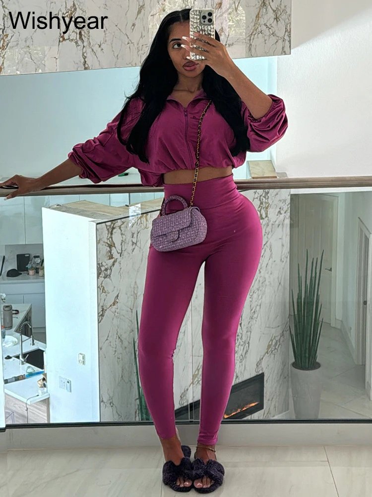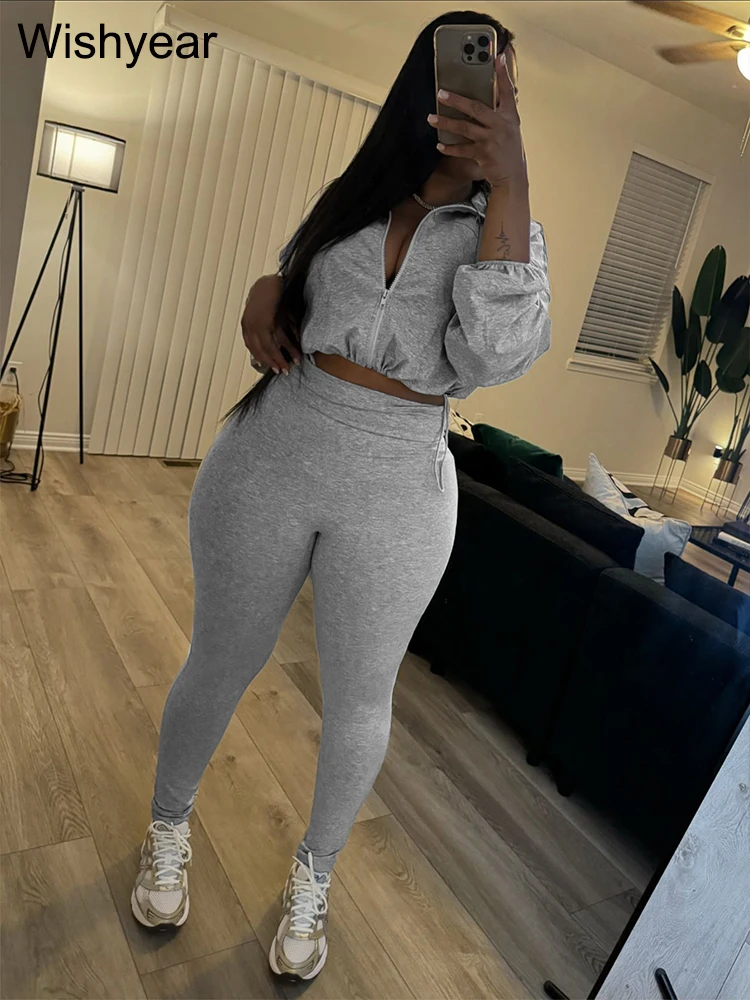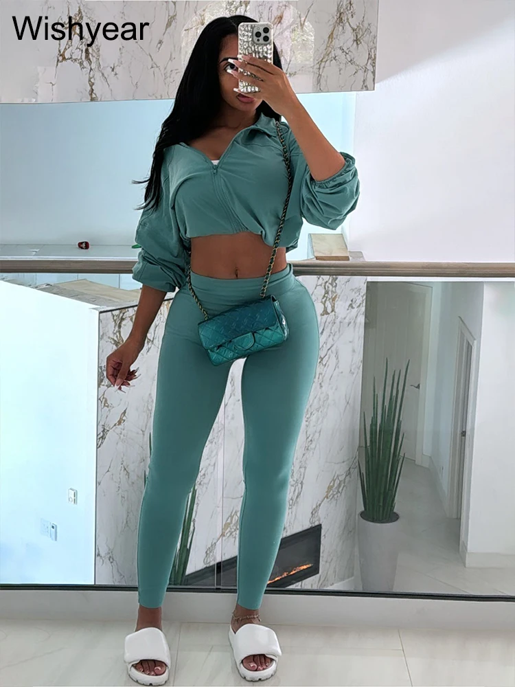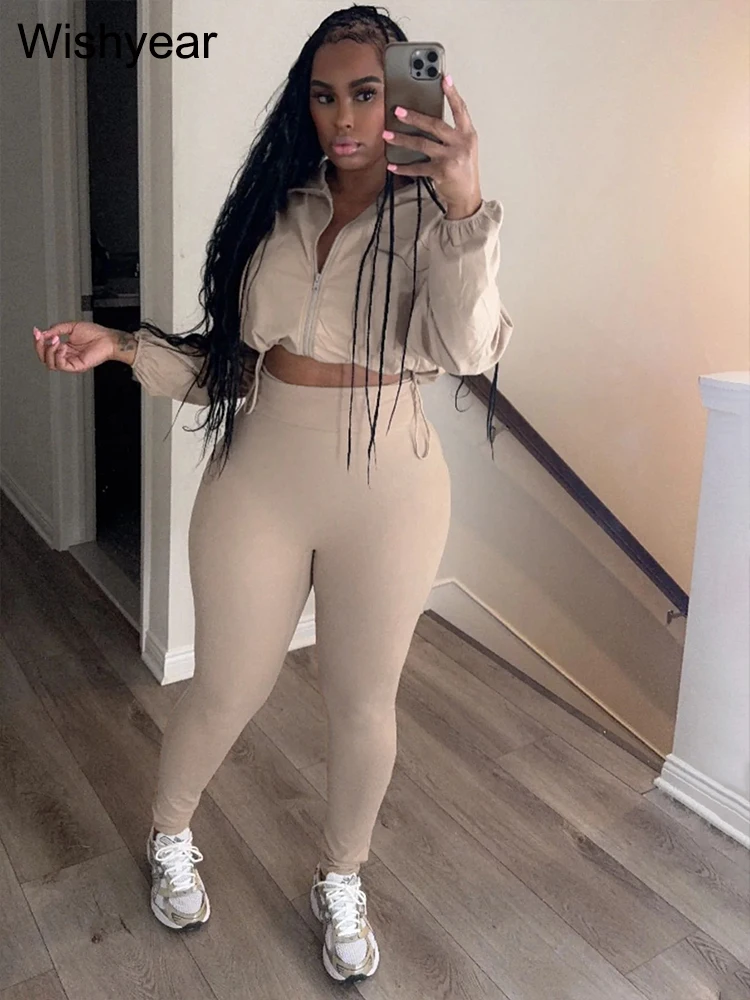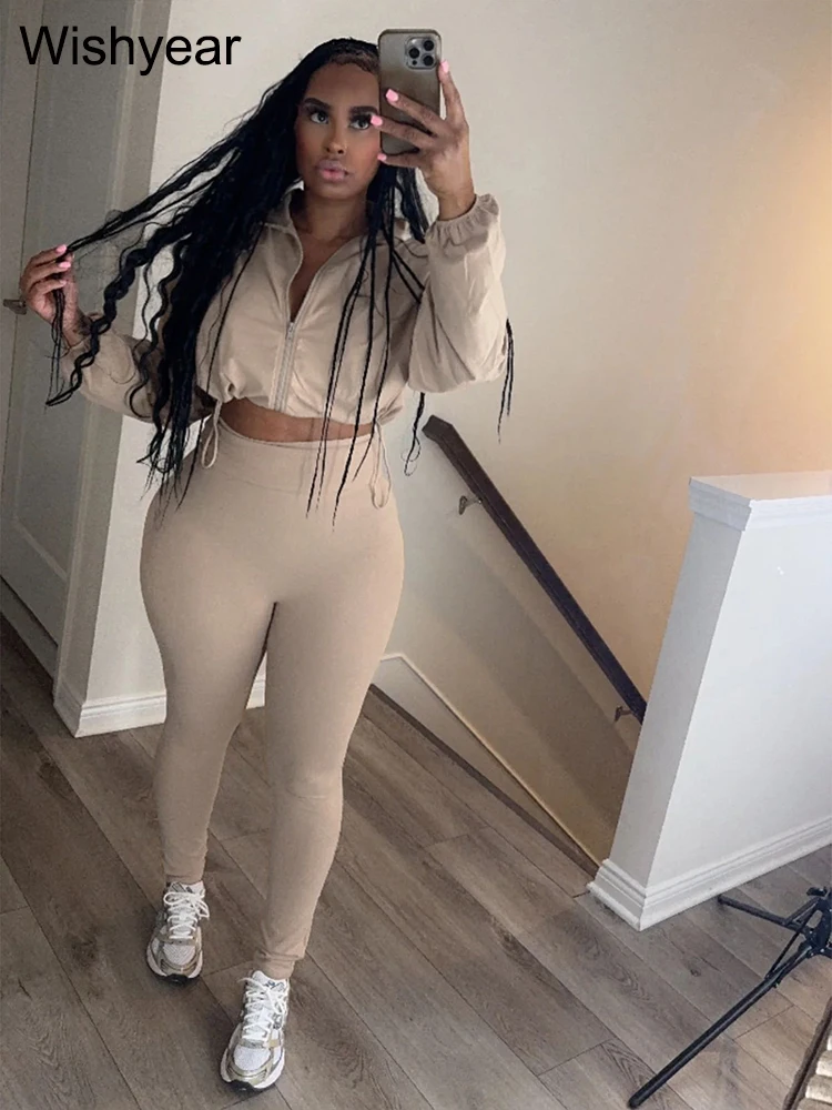 Fashion Khaki Jogging Pants Sets Women‘s Clothing Long Sleeve Crop Jacket and Leggings Two 2 Piece New Tracksuit Matching Suit